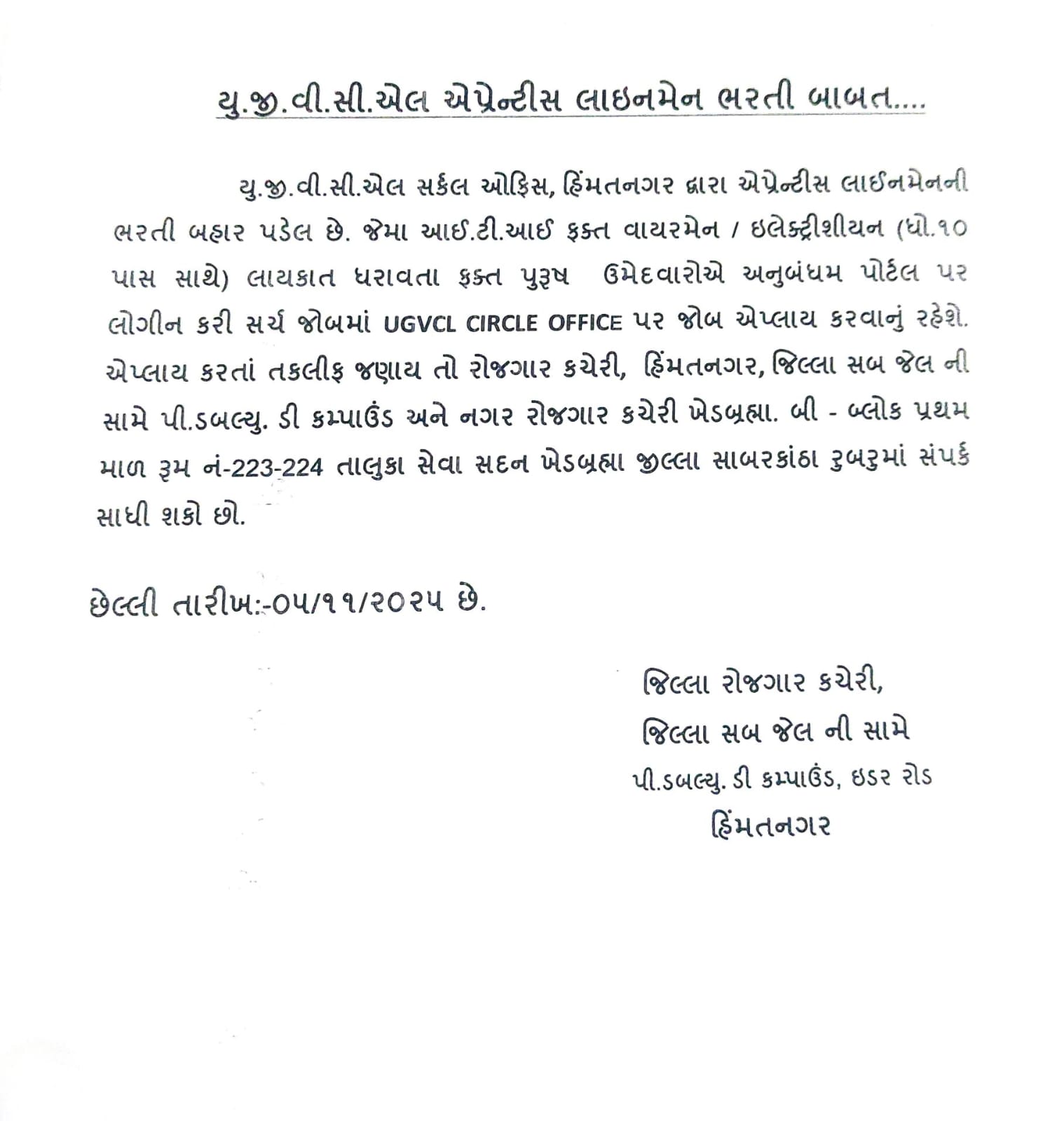 - જિલ્લા રોજગાર કચેરી, જિલ્લા સબ જેલ સામે, પી.ડબલ્યુ.ડી. કમ્પાઉન્ડ, ઈડર રોડ, હિંમતનગર.